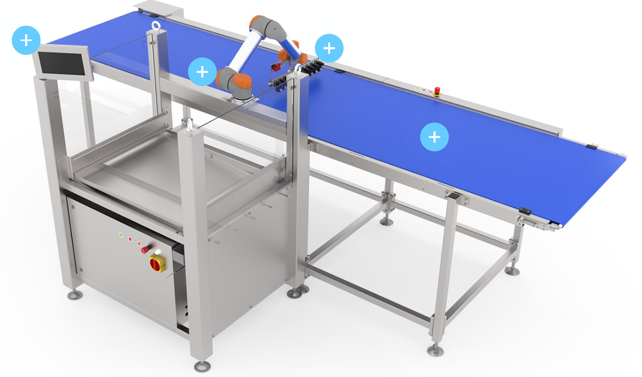 Powrót do listy produktówTo urządzenie do nacinania kęsów silnym strumieniem wody. Doskonale nadaje się do ciasta już po procesie fermentacji, a nawet bezglutenowego. Urządzenie może być dostosowane do wszystkich typów taśm transportowych i przenośnikowych linii produkcyjnych. Bośnia może być zbudowana z robotem współpracującym lub z systemem wyposażonym w trzy serwomotory i głowicę z dyszami. Wersja z robotem, dzięki inteligentnemu systemowi odczytu urządzenie rozpoznaje położenie każdego kęsa na tacy, a co za tym idzie nacinanie odbywa się we właściwym miejscu bez konieczności zatrzymywania taśmy transportowej. Programy i konfiguracje można zapisać w prosty i intuicyjny sposób, i mieć pewność, że dla danego produktu wzór nacięcia będzie zawsze taki sam.
