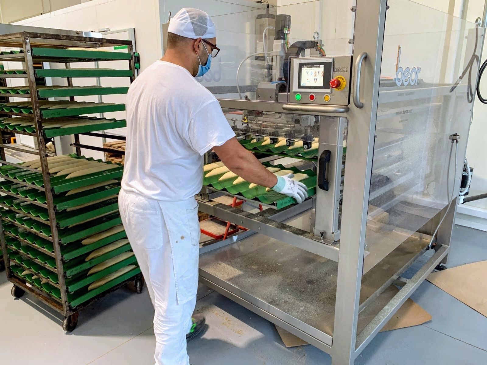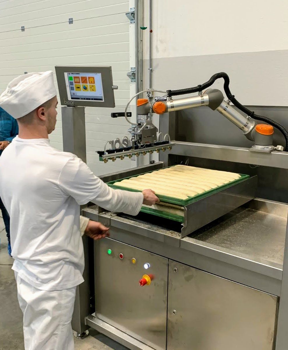 Powrót do listy produktówRobot automatycznie pobiera tace z wózka, wykonuje nacięcie i odkłada blachy z powrotem na wózek. Opcjonalnie można zainstalować posypywacz mąki. Maksymalna precyzja i delikatność pozwala zachować najlepszą jakość produktu, bez trwałego przecinania struktury kęsa oraz zbijania gary.
