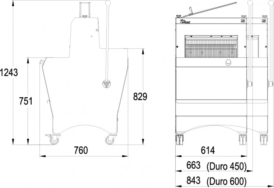 Krajalnica o tradycyjnej sprawdzonej konstrukcji. Posiada dźwignię, za pomocą której ustawia się ogranicznik dociskający chleb do noży w położenie, umożliwiające włożenie chleba do krajalnicy. Ogranicznik ten, za pomocą sprężyny, powraca w swoje pierwotne położenie, a chleb przechodząc przez noże jest krojony. Po pokrojeniu i zapakowaniu chleba czynność się powtarza.