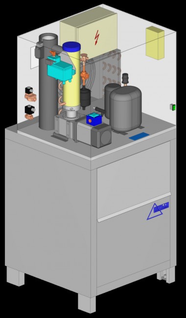 - urządzenia zabezpieczające: przekaźnik przeciążenia, presostaty wys. i niskiego napięcia, czujniki poziomu wody i lodu (jeśli ciśnienie spada i produkcja lodu jest niemożliwa urządzenia wyłącza się automatycznie i włącza ponownie, gdy ciśnienie wróci do normy)